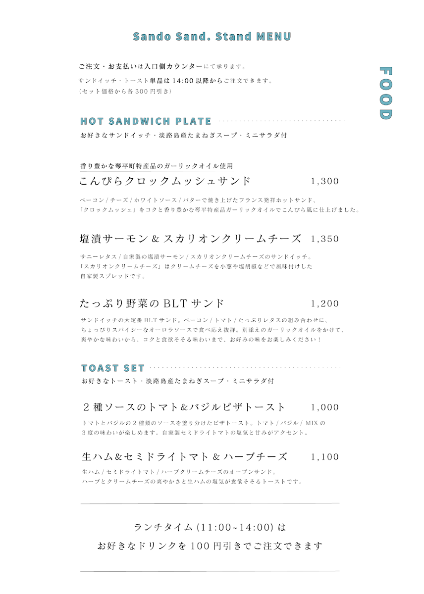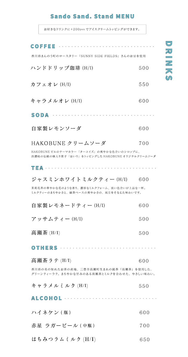 At Sando Sand. Stand, nestled in the charming Kotohira, Kagawa, guests are treated to a delightful café experience that celebrates quality and comfort. The menu boasts a selection of hand-crafted offerings, starting with their standout hand-drip coffee made from Indonesian Wahana Longberry beans, rich in flavor and meticulously brewed. Savor the renowned Vegetable-Packed BLT Sandwich—a hearty fusion of bacon, lettuce, and tomato enhanced with local garlic oil that adds a unique twist to a classic favorite.